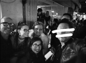El lugar estaba vivo ¡joder!. Las paredes vibraban con murales que parecían moverse con la música, mirándonos desde los rincones, como si ellos también quisieran un trago. Había arte por todos lados del artista gráfico Noel Rodríguez que contaban historias de la CDMX, de rincones olvidados, lienzos con negros tan vivos que dolían los ojos. Cada trago de mezcal era un recuerdo, cada copa de vino era una puñalada de nostalgia. Los compas del Bain, esos hermanos de batallas escolares, estaban por todos lados, abrazándose, gritando, recordando los días en que el mundo era un patio de recreo y Juan era el rey de las travesuras.