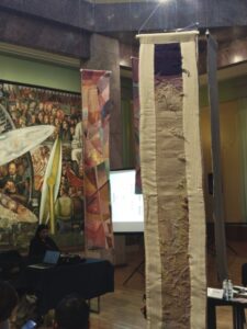 Caminar entre las piezas de Espectros es perderse en un laberinto suave. Los textiles, con sus formas fragmentadas y sus colores que dialogan con el mural de González Camarena, transforman la experiencia bidimensional en algo táctil, tridimensional, casi vivo. La instalación no impone, invita. Es como si las telas susurraran al espectador: “toca, aunque sea con los ojos; transita, aunque sea con el alma”. Este desborde del muralismo tradicional, que Carrillo logra con una mirada crítica y poética, recuerda el pincel de Camarena haciendo una obra que seduce no por su grandilocuencia, sino por su capacidad de acercarse, de hacerse cómplice.