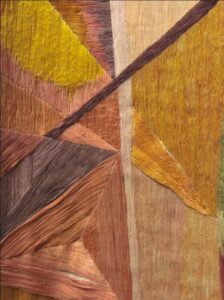 Espectros no es solo una instalación: es un diálogo. Un susurro entre lo ancestral y lo contemporáneo, entre lo rígido del mural y lo efímero del textil. Doce piezas bordadas a mano, dispuestas en triadas, flotan frente al mural Liberación (1963) de Jorge González Camarena, como fantasmas que reinterpretaran una historia ya contada. Carrillo, con la sensibilidad de quien hurga en el inconsciente colectivo, descompone la obra original a través de la numerología, el I-Ching y la carta astral, tejiendo un lenguaje que no se lee en líneas rectas, sino en hilos que se cruzan, se anudan, se desbordan.