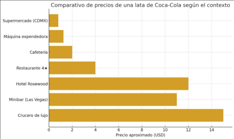 En una tienda de barrio cuesta 15 pesos, en una máquina expendedora $20, en una cafetería de museo $35, en un restaurante de cuatro estrellas $70, en el minibar de un hotel de Las Vegas $250, y en la terraza de un palacio veneciano o del Burj Al Arab en Dubái puede superar los 400 pesos.